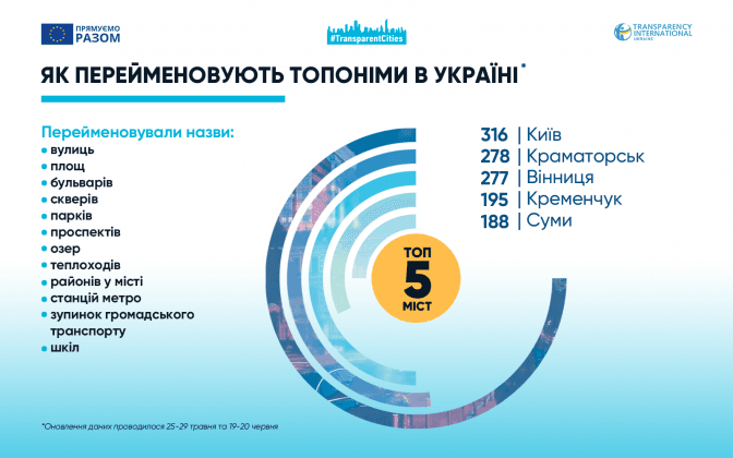 У п'ятірку за кількістю перейменованих топонімів увійшли: Київ (316), Краматорськ (278), Вінниця (277), Кременчук (195), Суми (188).