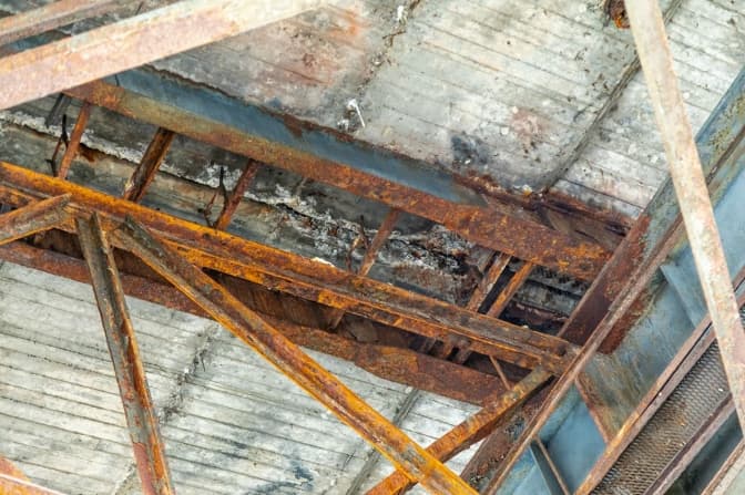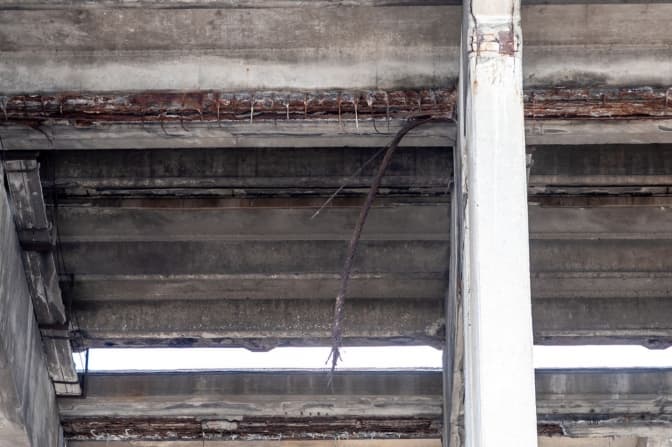 Візуальний огляд виявив суцільну корозію балок та головних елементів прогонів, поздовжні тріщини у поверхнях опор з утворенням сталактитних відкладень всередині, руйнування бетону, наскрізну корозію балок у місцях зʼєднання з поперечними вузлами.