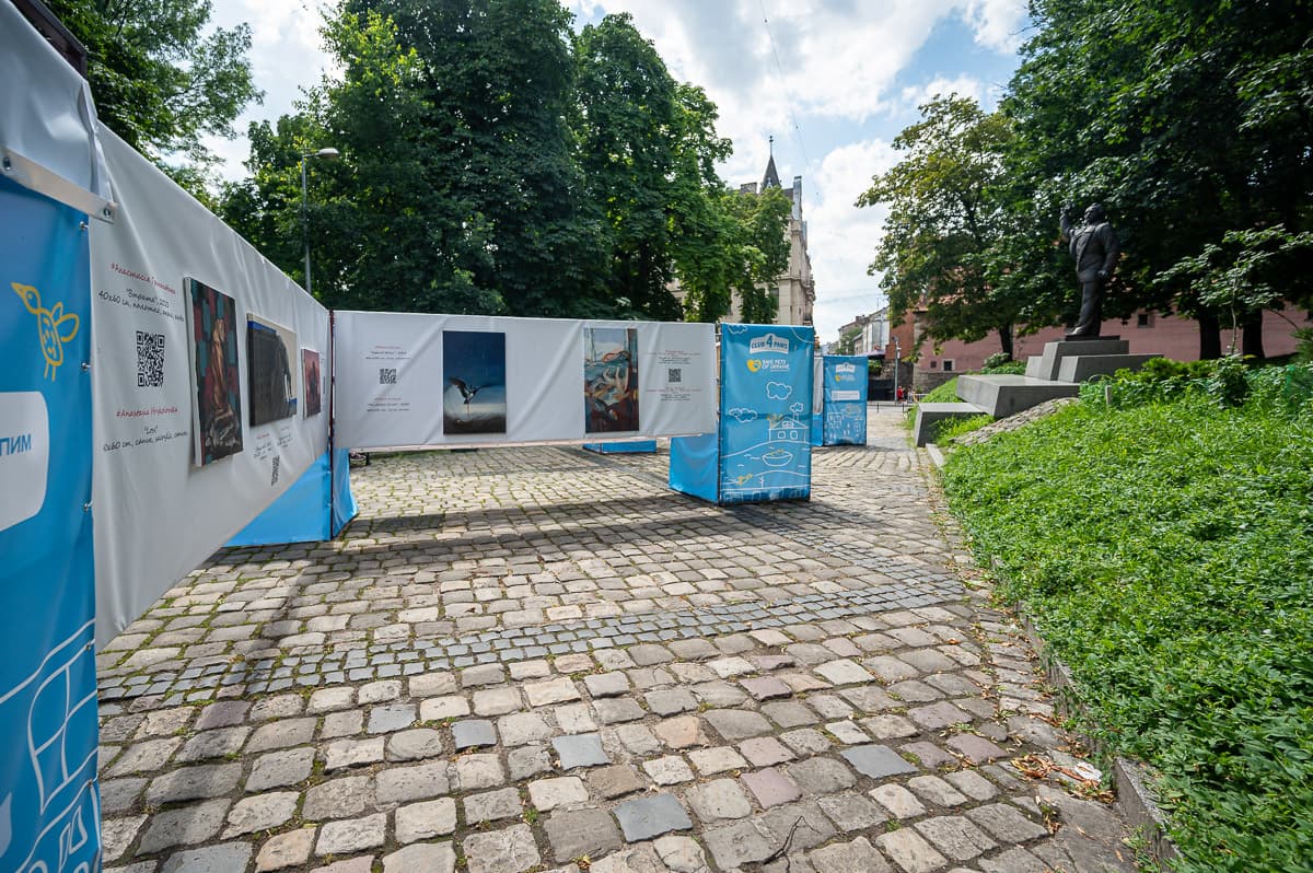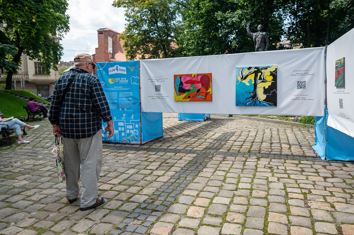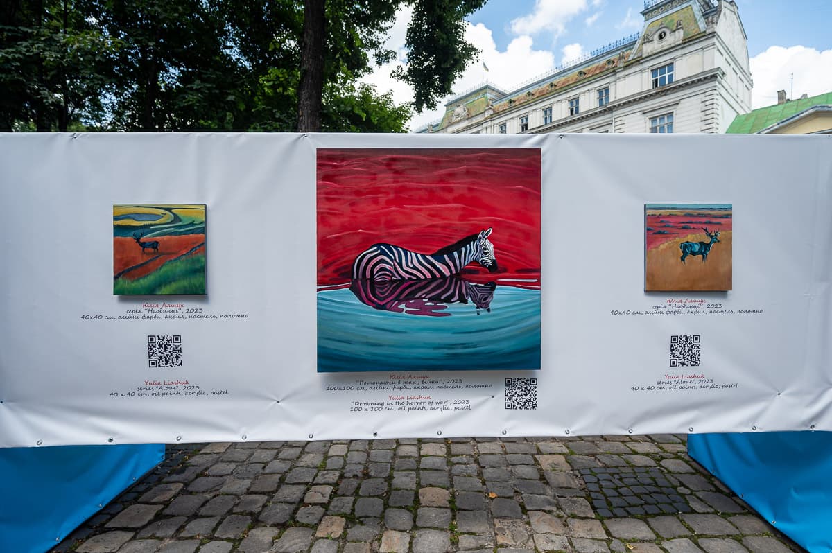 У львівському сквері «На Валах» відкрили виставку картин «Тварини війни». На картинах зображені реальні історії про тварин, які також страждають від війни.