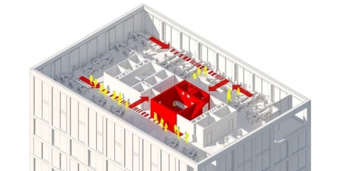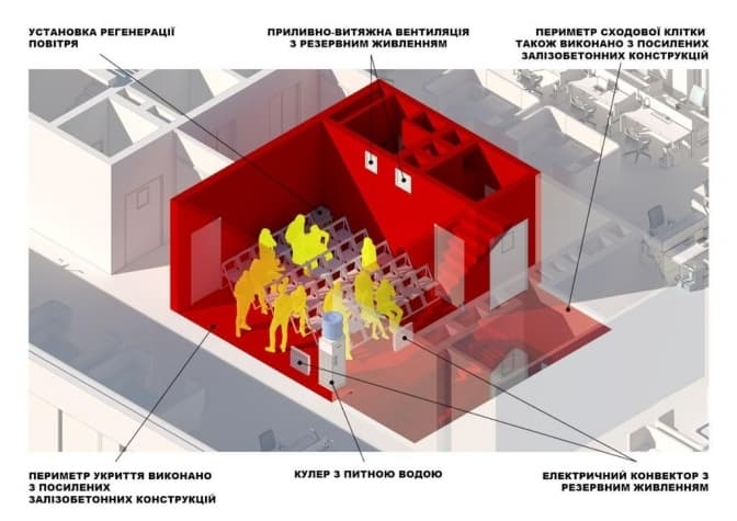 «І от саме у трьох таких будівлях передбачили безпечні кімнати-укриття. На кшталт ізраїльських. Проєктанти порахували, що на одному поверсі в офісах працюватимуть близько сорока людей. Тому запроєктували по 0,6 квадратного метра на людину в безпечній кімнаті. Периметр укриттів буде з посилених залізобетонних конструкцій. Вони розміщатимуться в центрі будівель на усіх поверхах, кожен з яких сполучать безпечною сходовою кліткою - теж із посилених залізобетонних конструкцій для евакуації людей безпосередньо на вулицю», – підкреслив Любомир Зубач.