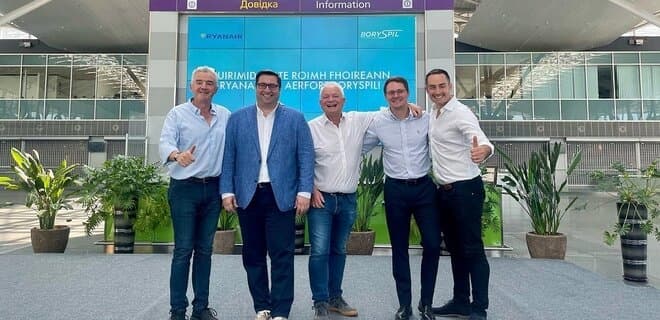 «Представники аеропорту Бориспіль зустрічають найвище керівництво Ryanair – головного виконавчого директора групи Ryanair Group Майкла О’Лірі, головного виконавчого директора Ryanair DAC (ірландська юрособа Ryanair. – ред.) – Едді Вілсона та комерційного директора Ryanair DAC Джейсона МакГіннеса», – йдеться в повідомленні.