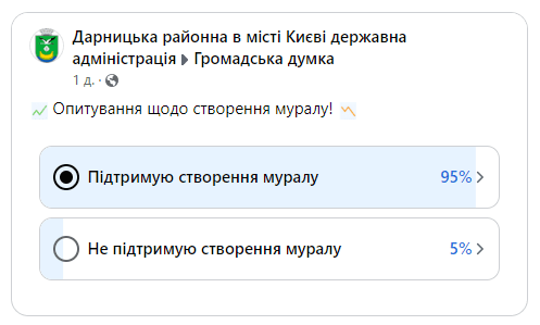 Дарницька РДА на своїй сторінці у Facebook проводить опитування серед жителів району щодо створення муралу на стіні будинку № 4 по вулиці Ахматової.