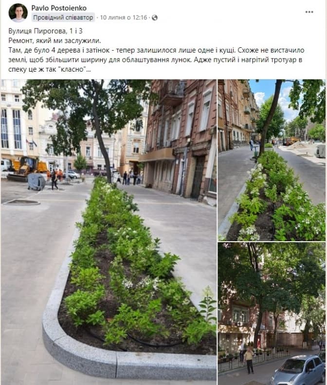 Раніше активіст Павло Постоєнко акцентував на вирубці щонайменше трьох дерев під час ремонту на Пирогова. Загалом, за його спостереженнями, було ліквідовано три можливих місця для посадки дерев. «Було 4 дерева і затінок. Тепер залишилося лише одне і кущі. Схоже не вистачило землі, щоб збільшити ширину для облаштування лунок. Адже пустий і нагрітий тротуар в спеку це ж так "класно", – написав активіст. – Кожне дерево (лунка) у центрі міста - на вагу золота, тому це не можна пробачати».