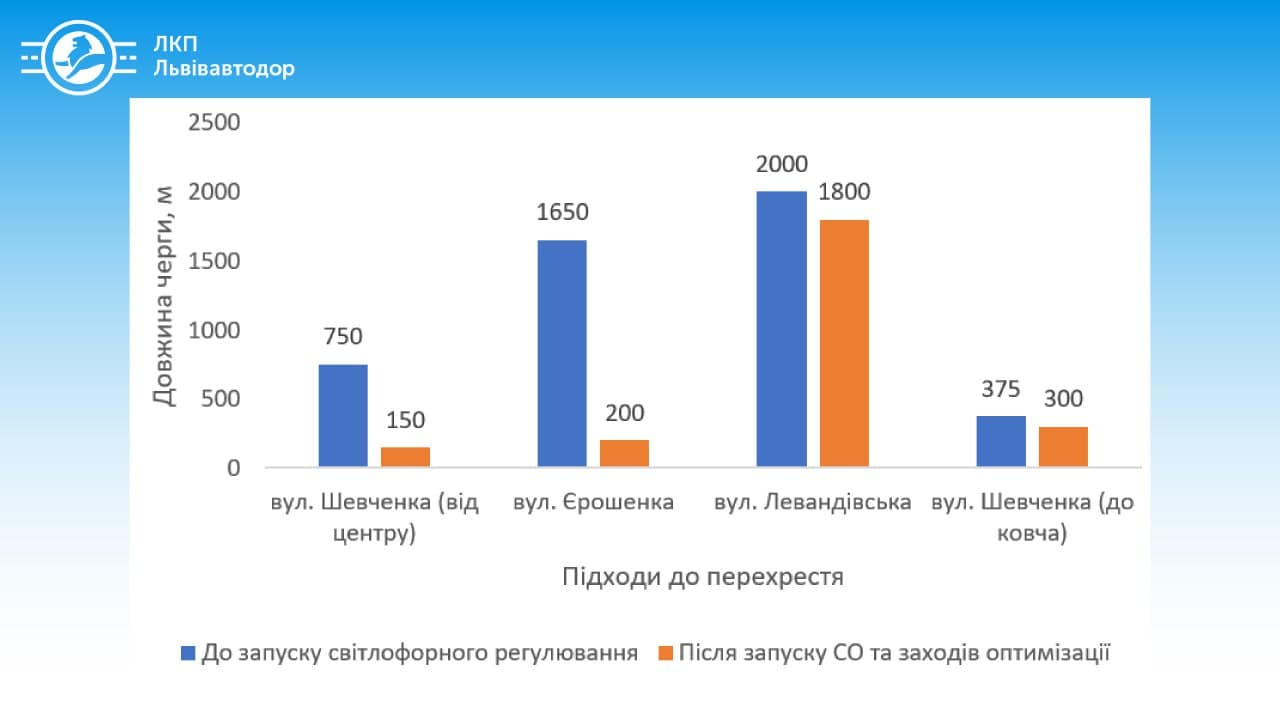 - вул. Шевченка в напрямку від центру – черга із транспортних засобів становить 150 м. На момент запуску світлофорного регулювання черга становила 750 м, що у 5 разів більше.