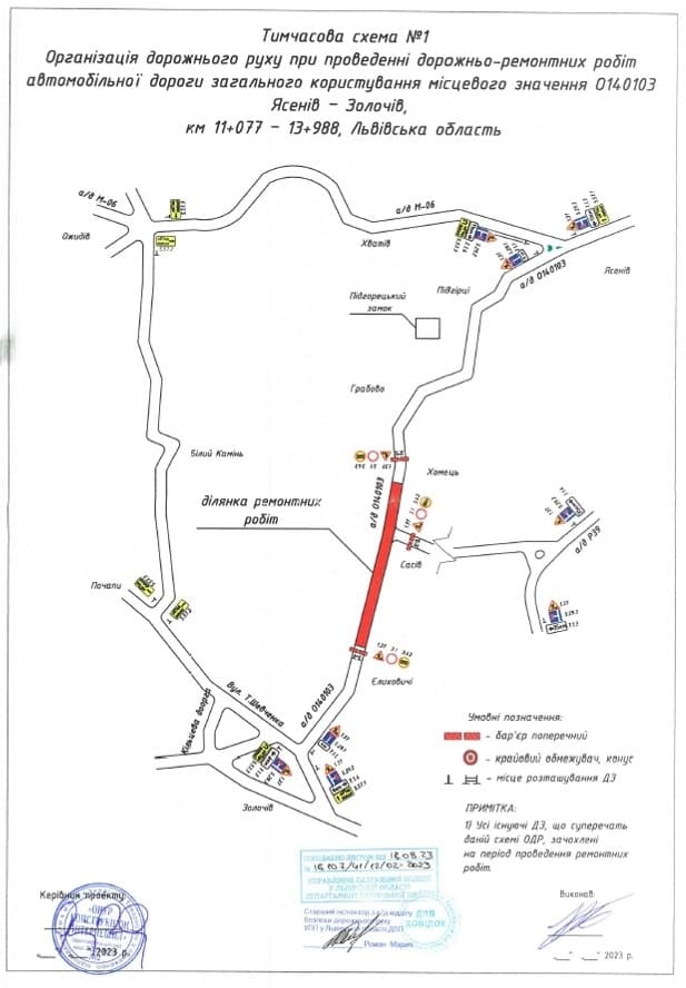 У зв’язку з ремонтом ділянки автомобільної дороги загального користування місцевого значення О140103 Ясенів-Золочів км 11+077 - 13+988 перекриють рух автомобілів. Про це повідомив департамент дорожнього господарства Львівської ОВА.