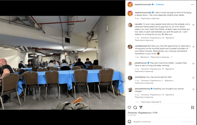 Читайте таож: Стівен Фрай поділився враженнями від повітряної тривоги в Києві. «Люди сміються і досить весело базікають. Жодних звуків дронів або ракет, які наближаються, які я міг би чути», – зазначив письменник.