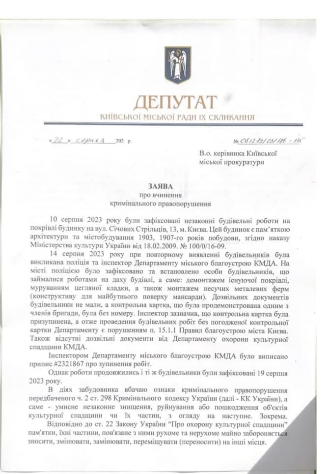Перов наголосив, що ст. 22 ЗУ «Про охорону культурної спадщини» забороняє надбудову та перебудову памʼяток.