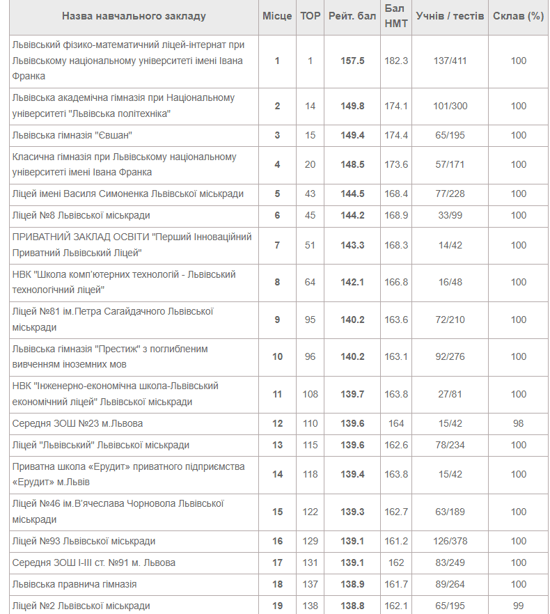 Рейтинг усіх львівських шкіл за результатами НМТ