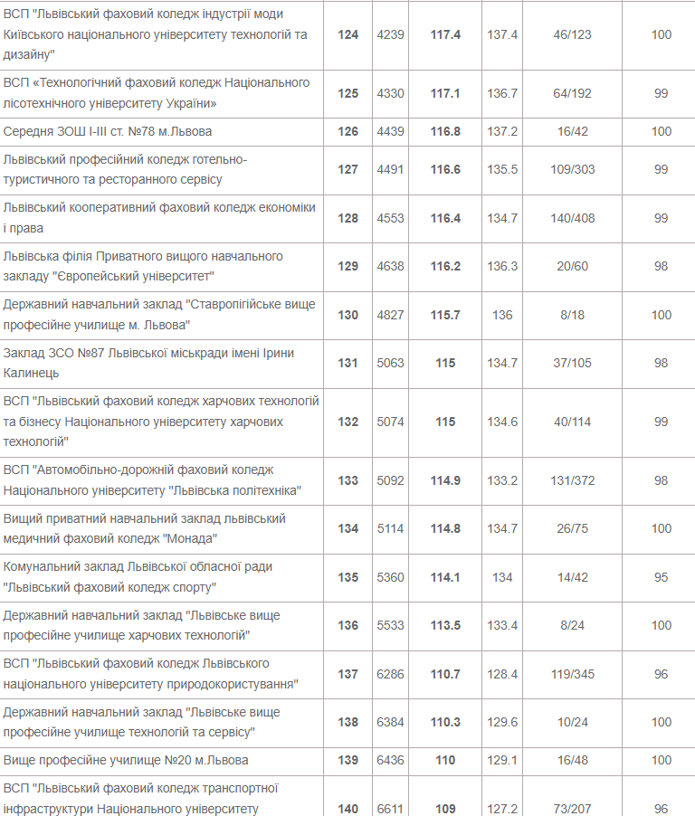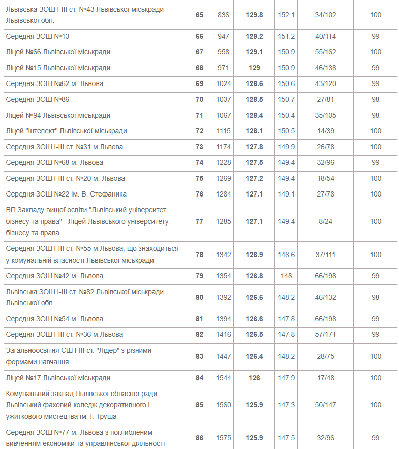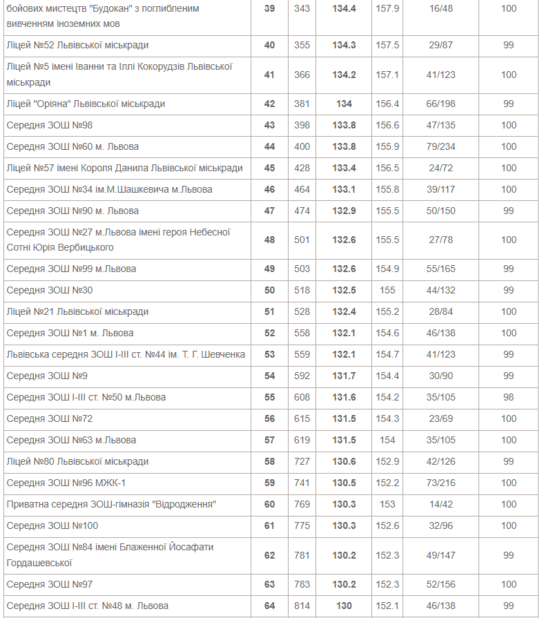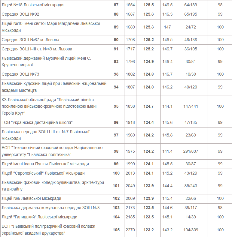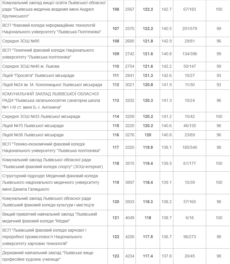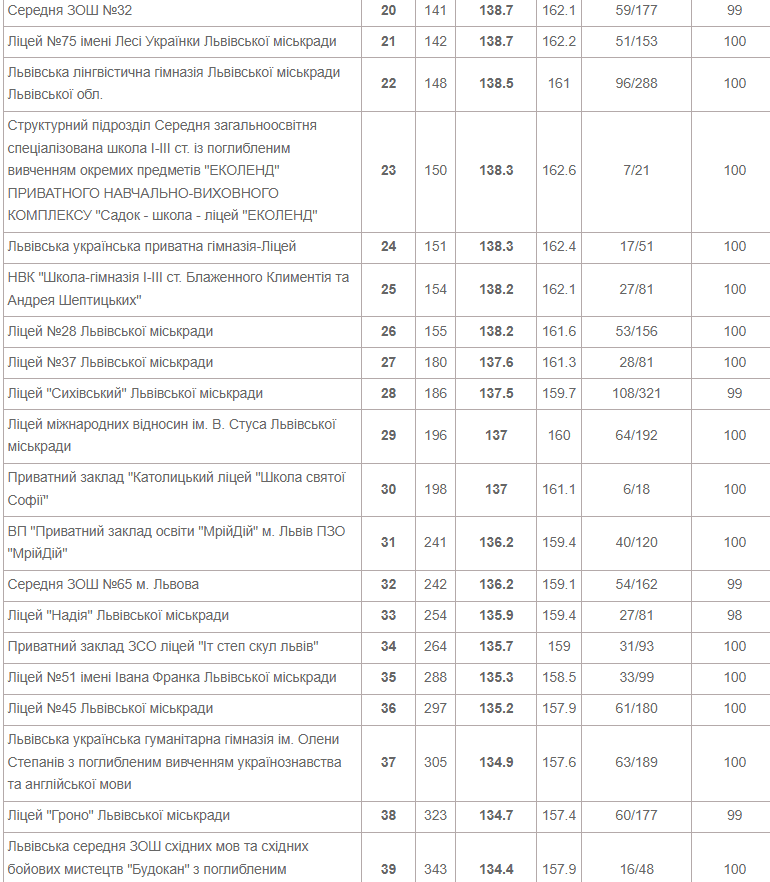 Також до двадцятки лідерів увійшли Львівська академічна гімназія при Національному університеті «Львівська політехніка», львівськая гімназі «Євшан» і класична гімназія при Львівському національному університеті імені Івана Франка.