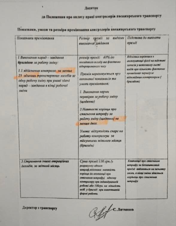 Із документів за підписом директора з транспорту «Київпастрансу» Сергія Литвинова випливає, що для того, щоб отримати місячну премію контролер має штрафувати не менше ніж 2 безбілетників за кожну зміну.