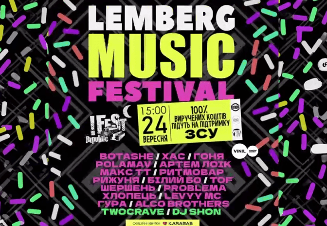 У неділю, 24 вересня на терасі !FESTrepublic велика кількість реп та хіп-хоп артистів обʼєднаються заради благодійної мети. Виконавці: BOTASHE, ХАС, Гоня, POLAMAV, Артем Лоік, Макс ТТ, Ритмовар, Рижуня, Білий Бо, Шершень, ХЛОПЕЦЬ, PROBLEMA, Levyy MC, Гура, TOF, ALCO Brothers. DJ‘s: Shon, TWOCRAVE. 100% прибутку скерують на потреби українського війська. Квитки за посиланням.