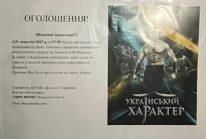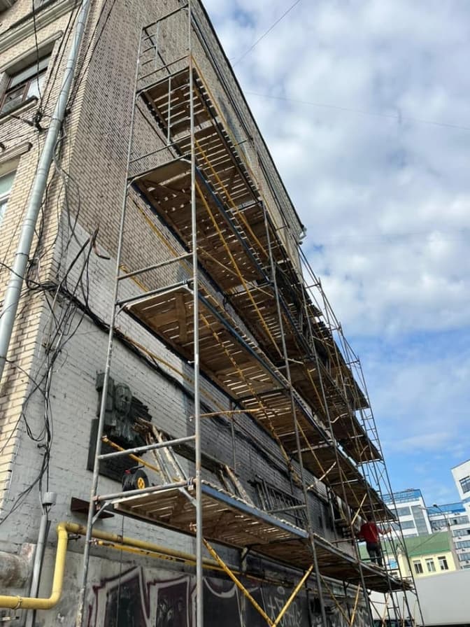 Кілька днів тому біля фасаду з’явилися риштування та оголошення про створення «тимчасового патріотичного муралу» на місці попереднього. При цьому стверджується, що згодом стіну буде утеплено.