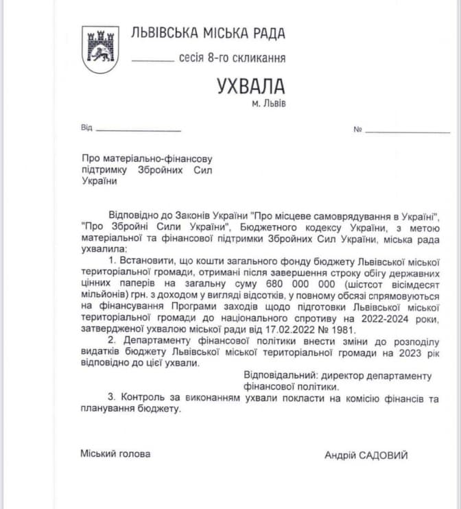 Нагадаємо, що у Львові збільшать видатки на військові частини до 1 млрд грн. До вже існуючих 750 млн додадуть 250 млн грн, які виділять з коштів, отриманих на військових облігаціях.