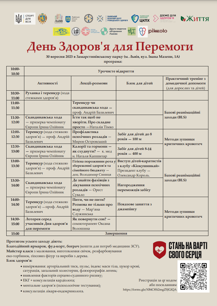 У програмі – оздоровчі елементи скандинавської ходи та теренкуру. Діти зможуть позмагатися в бігу. Протягом усього часу працюватиме благодійний ярмарок та майстер-класи. Зібрані кошти спрямують на наплічники для військових медиків.