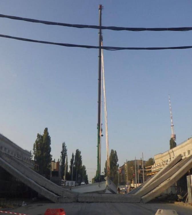 Як ми писали, під час реконструкції Дегтярівського шляхопроводу обвалились 7 залізобетонних балок. У «Київавтодорі» пояснили, що «під час монтажу сьомої балки в проєктне положення вона втратила свою стійкість і впала. При падінні балка зачепила частину вже змонтованої конструкції, що призвело також до порушення її стійкості та падіння інших 6-ти балок прогонової будови»