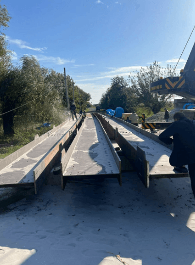 Вже виконано роботи із битонування конусів мосту, шпаклювання та фарбування опор, зварювання металевих балок та влаштовано 4 балки з 8.