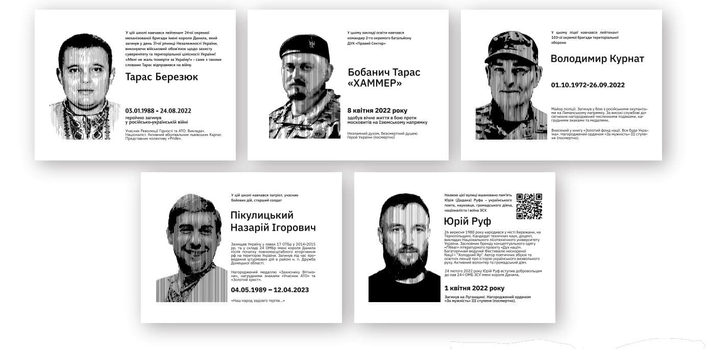Таблицю Тарасу Березюку облаштують на фасаді середньої загальноосвітньої школи № 1 на вул. К. Трильовського, 17. На тому ж фасаді встановлять таблицю Назарію Пікулицькому. На фасаді СЗШ № 23 на вул. Варшавській, 126 облаштують меморіальну таблицю Миколі Панченку. Також таблицю Тарасу Дідуху встановлять на фасаді будинку № 2-В на вул. Науковій.