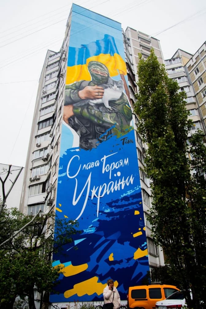 На стіні багатоповерхівки на вул. Анни Ахматової з'явився 50-метровий мурал на вшанування пам'яті всіх добровольців, які загинули захищаючи Україну. Про це повідомив очільник Дарницької райдержадміністрації Микола Калашник.