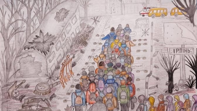 Та: Школярка перемогла на міжнародному конкурсі з картиною «Вихід з окупації Бучі». «Міжнародне журі вразила робота бучанки і її глибока історія».