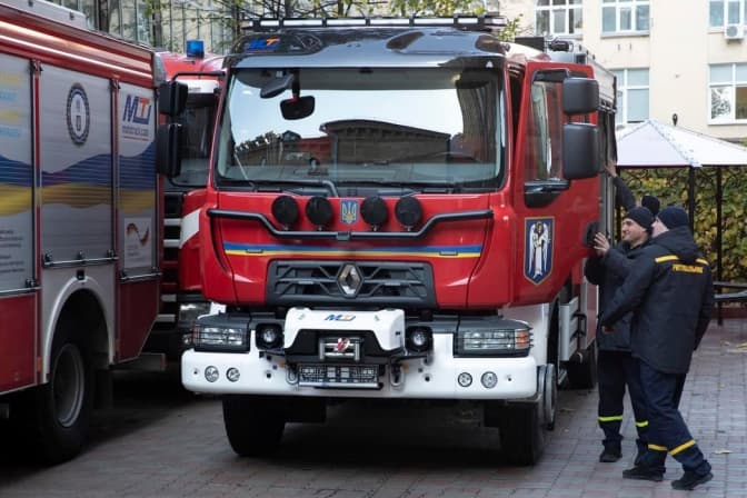 «Це 3 машини Renault з колісною формулою 4х4 та сучасними системами пожежогасіння. Передало пожежні Києву німецьке місто-побратим Лейпциг, профінансувало Федеральне міністерство економічного співробітництва та розвитку Німеччини. А виробили в найкоротші терміни польські партнери», - розповів мер.