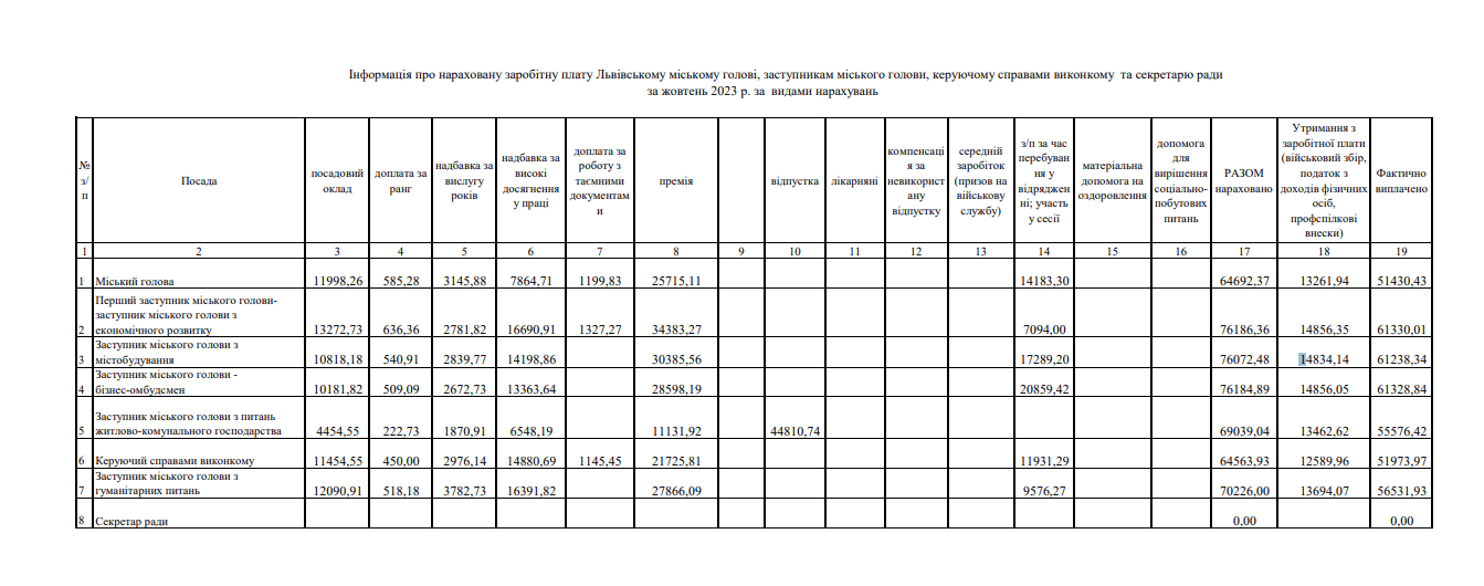 Львівська міська рада оприлюднила зарплати міського голови та його заступників. Зокрема, у жовтні Андрій Садовий отримав 51 тис. 430 грн зарплатні. Оклад мера становить 11 тис. 998 грн, премія – 25 тис. 715 грн. За високі досягнення в праці йому виплатили 7864 грн, а за роботу з таємними документами нарахували 1200 грн.