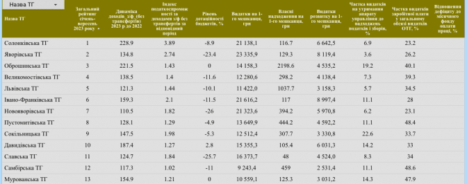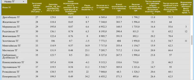 Водночас Боринська, Підкамінська, Стрілківська, Хирівська та Добромильська громади посіли останні місця. Рівень дотаційності їхніх бюджетів становить понад 40-50%.