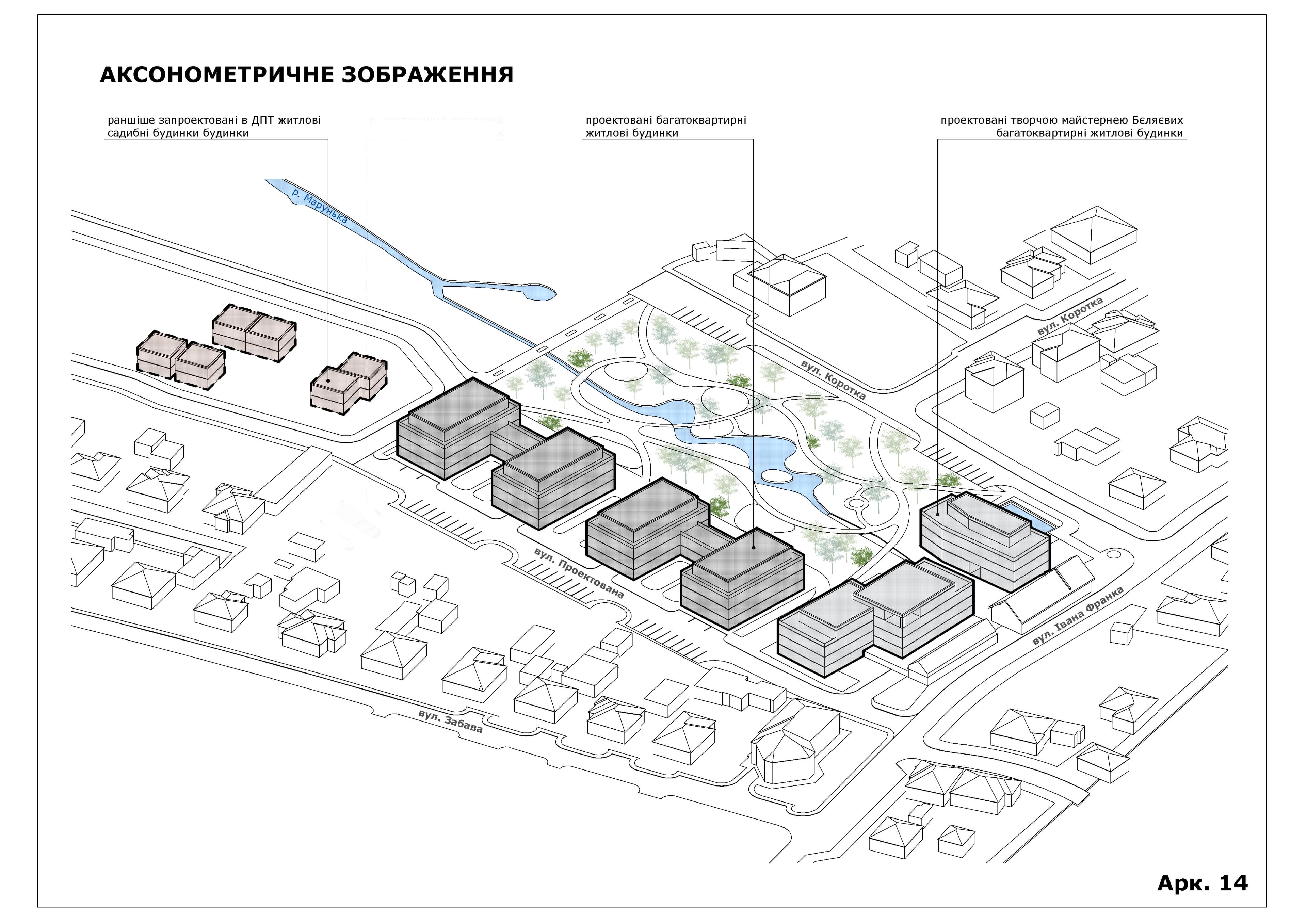 Проєктом детального плану врахували надані проєктні пропозиції щодо розташування нової багатоквартирної житлової забудови та реконструкції існуючих будівель для влаштування громадських приміщень на вул. Івана Франка, 114 (проектна майстерня Бєляєвих) на існуючій ділянці громадської забудови зі зміною її функції на територію житлової багатоквартирної забудови. Забудова передбачається висотою до 4-х поверхів.