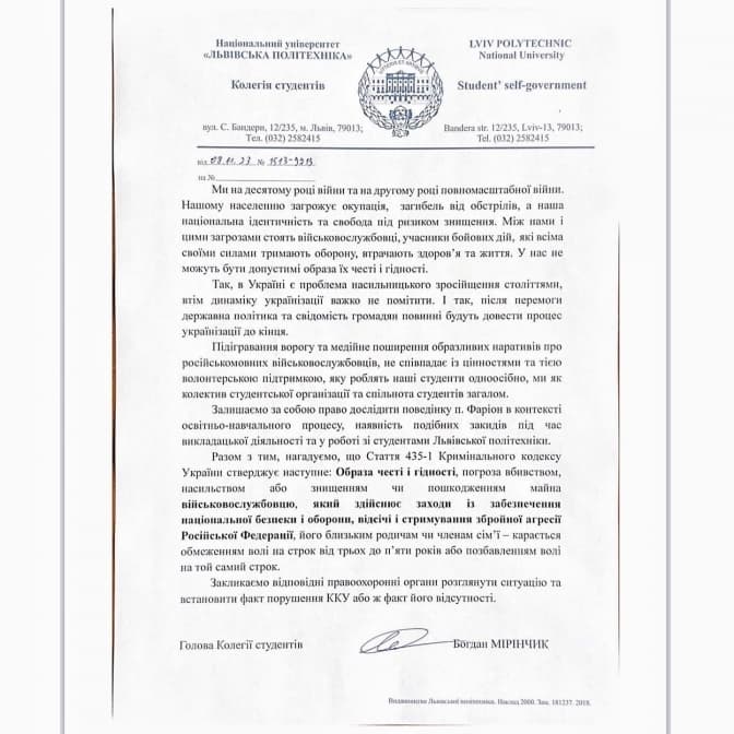 «Підігравання ворогу та медійне поширення образливих наративів про російськомовних військовослужбовців не співпадає з цінностями та тією волонтерською підтримкою, яку роблять наші студенти. Залишаємо за собою право дослідити поведінку п. Фаріон в контексті освітньо-навчального процесу, наявність подібних закидів під час викладацької діяльності та у роботі зі студентами «Львівської Політехніки», – йдеться у документі.