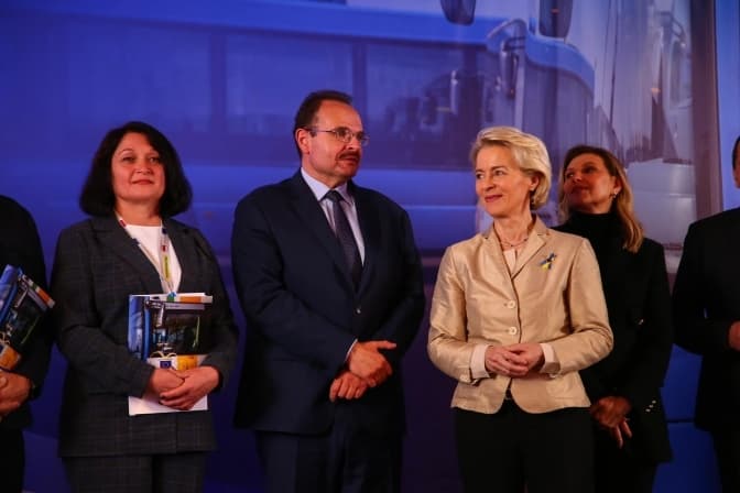 На заході з передачі останніх 10 автобусів була присутня президентка Європейської Комісії Урсула фон дер Ляєн, перша леді України Олена Зеленська та президент Фонду міжнародної солідарності Рафал Дзєнцьоловський.
