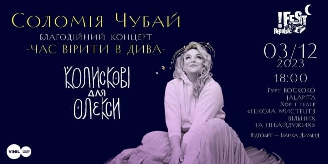 У рамках концертної програми «Час вірити в дива» для гостей готують інтерактивну взаємодію з дитячим співочим театром «Школи мистецтв вільних і небайдужих» під керівництвом Олега Онещака, унікальний відеоарт від студії «Іванчина майстерня», який наживо створюватиме сама Іванка Димид та, звісно, терапевтичне соло Соломії Чубай з музичним супроводом гуртів «ROCKOKO» та «JALAPITA».