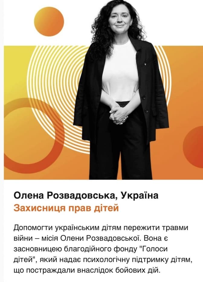 «Допомогти українським дітям пережити травми війни – місія Олени Розвадовської. Організація з'явилася у 2019 році, за чотири роки після того, як Розвадовська стала волонтером у прифронтових районах Донбасу. Нині у фонді працюють понад 100 психологів у 14 центрах, є також безкоштовна гаряча лінія. Фонд допоміг десяткам тисяч дітей та батьків», – йдеться у публікації ВВС.