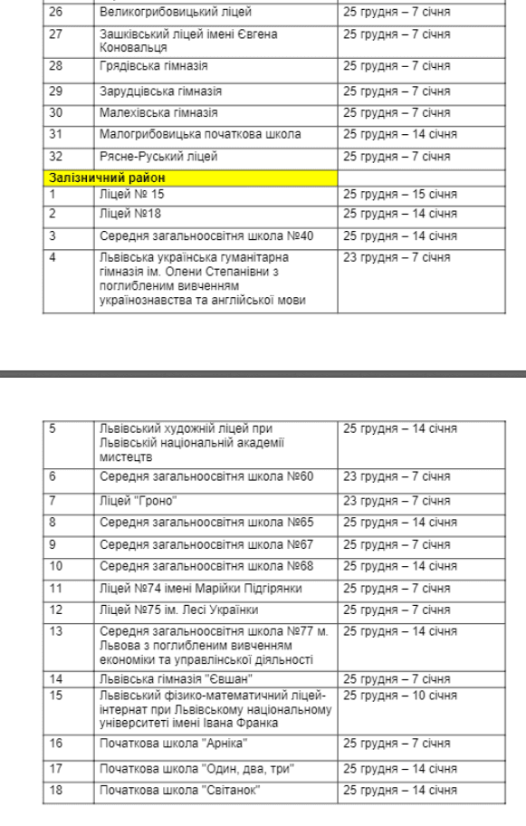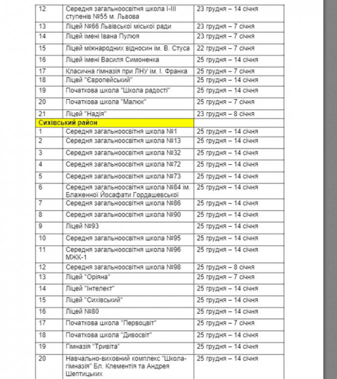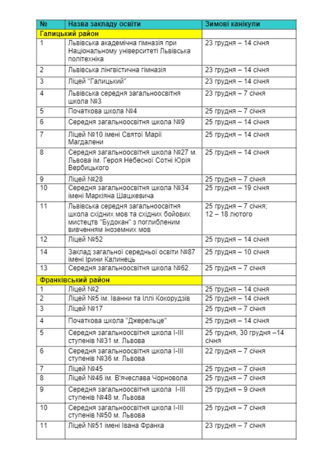 Більшість школярів Львівської міської територіальної громади матимуть зимові канікули з 25 грудня. Триватимуть канікули орієнтовно 2-3 тижні. Раніше керівник управління освіти ЛМР Андрій Закалюк Tvoemisto.tv повідомив, що кожна школа Львова самостійно визначає дату та кількість днів, коли учні відпочиватимуть взимку. Так деякі матимуть 21 день канікул.