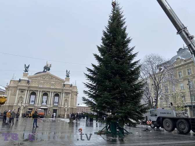 5. У центрі Львова встановили різдвяну ялинку. Як вона виглядає. Для оздоблення використають минулорічні іграшки, освітлення та протитанковий їжак замість зірки на верхівці дерева.