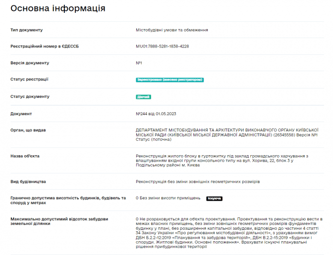 На Порталі Єдиної державної електронної системи у сфері будівництва вказано, що Департамент містобудування та архітектури КМДА видав Містобудівні умови та обмеження для реконструкції жилого блоку в гуртожитку під заклад громадського харчування з влаштуванням вхідної групи консольного типу.