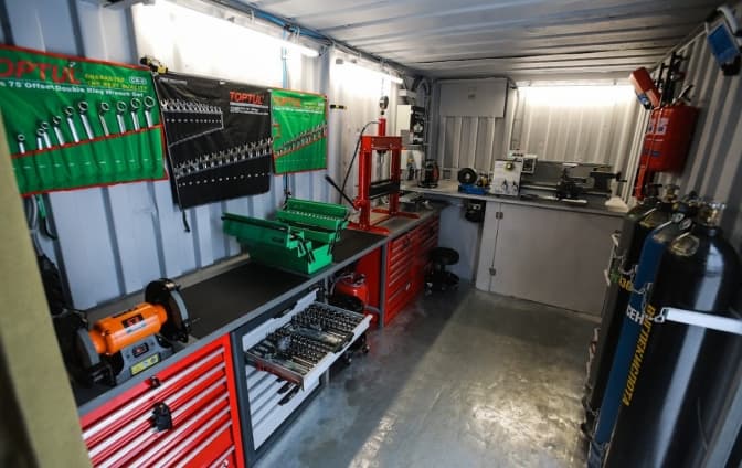 Перший — це безпосередньо майстерня. Її завдання — ремонт і виготовлення запчастин. В ній облаштовано 7 потужних станків, які виконують різні функції: прес на 20 тонн, свердлильно-фрезерний верстат, токарно-гвинторізний верстат, обтискач для рукавів високого тиску і т.д.
