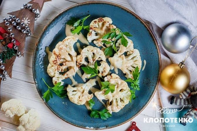 Головку цвітної капусти добре промийте та висушіть. Розріжте капусту вздовж навпіл, потім наріжте кожну з половинок уздовж на слайси товщиною приблизно 1 см. Потім за допомогою ножа відокремте суцвіття капусти від основи. Розігрійте пательню з 1 ст. л. рослинної олії. Обсмажте капусту до золотистої скоринки з обох боків, посоліть і поперчіть за смаком, додайте 0,5 ч. л. ароматних сухих трав. Для приготування соусу змішайте пасту тахині (2 ст. л.) з 1 ст. л меду. Додайте лимонний сік (1 ст. л.) і добре перемішайте. Якщо ви захочете зробити соус більш рідким, додайте трохи теплої води і перемішайте. При подачі полийте цвітну капусту соусом з тахіні.