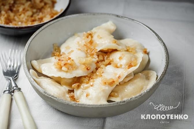 Почистьте 300 г картоплі та наріжте її великими кубиками. Перекладіть в каструлю, залийте водою і варіть 15-20 хв до готовності. У великій мисці змішайте 360 г борошна, 180 мл води, ½ ч.л. солі, 2 ст. л. олії та замісіть еластичне тісто. Накрийте миску рушником або харчовою плівкою і дайте йому відпочити 15 хв. 2 цибулини очистьте, наріжте дрібними кубиками та обсмажте на розігрітій сковорідці з 3 ст. л. олії до золотавого кольору. З готової картоплі злийте воду, додайте половину обсмаженої цибулі та потовчіть товкачкою. Додайте до начинки ⅓ ч.л. чорного перцю, посоліть до смаку і перемішайте. Дайте начинці охолонути. Робочу поверхню присипте борошном. Тісто розкачайте в пласт, товщиною 0,5 мм. За допомогою склянки видавіть із тіста кружальця. На кожне таке кружальце викладіть картопляну начинку, приблизно по 1 ч. л. з гіркою. Пучками пальців защепіть краї вареників. У каструлю наберіть води, доведіть до кипіння та посоліть, приблизно ⅓ ст. л. солі. Викладіть вареники в окріп та варіть 5 хв. Виберіть готові вареники з каструлі, перекладіть в миску, додайте смажену цибулю.