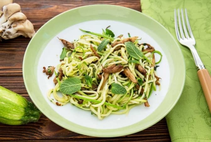 Інгредієнти: 300 г цукіні або кабачків, 150 г глив, 2 ст. л. лимонного соку, 1 ст. л. оливкової олії, 2 гілочка м'яти, сіль та перець до смаку.