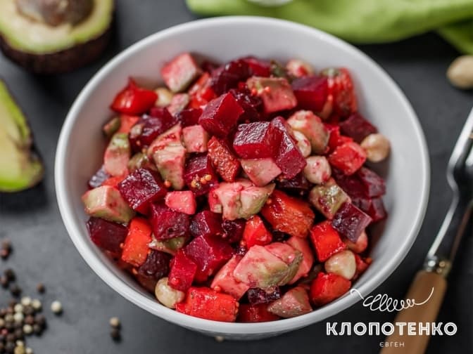 Інгредієнти: 1 шт. буряк, 1 шт. морква, 100 г ядра лісових горіхів (або будь-яких за смаком), 1 шт. авокадо, 2-3 ст. л. соняшникова олія, 1-2 ст. л. бальзамічний оцет, 1 ч. л. гірчиця (французька у зернах), за смаком Сіль та перець.