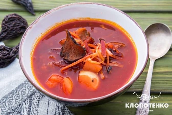 Розігрійте духовку до температури 180 градусів. Візьміть середнього розміру буряк помийте, загорніть у фольгу та покладіть у духовку на 90 хвилин. Потім дайте охолонути та очистьте, натріть на тертці з великими отворами. Велику морквину також натріть, цибулю поріжте дрібними кубиками. Розігрійте пательню з 2 ст. л. соняшникової олії. Викладіть спочатку цибулю та моркву, обсмажте протягом 3 хвилин. Додайте натертий буряк та смажте ще 2 хвилини. Всипте на пательню 1 ст. л. цукру та викладіть 2 ст. л. томатної пасти. Перемішайте та тушкуйте ще 2 хвилини. Очистьте 2 картоплини середнього розміру та наріжте невеличкими кубиками. Влийте у каструлю 2 л води та викладіть картоплю. Додайте 2 лаврових листи та трохи солі. Доведіть до кипіння, зменшіть вогонь та варіть ще 5 хвилин. Дрібно пошаткуйте 150 г білокачанної капусти. Додайте у каструлю та варіть 15 хвилин. Після цього перекладіть у каструлю овочеву засмажку. Наріжте тонкими слайсами 2 в'ялених груші, викладіть у каструлю. Скуштуйте та додайте сіль і перець до смаку, варіть ще 7 хвилин. Наприкінці додайте дрібно порізані 2 зубчики часнику.