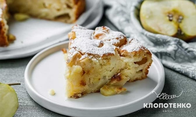 Інгредієнти: 220 г борошна, 1 апельсин (100 мл апельсинового соку + цедра), 100 мл соняшникової олії, 1,5 ч. л. розпушувача, 140 г цукру, 10 г ванільного цукру, 1 ч. л. цукрової пудри, 3-4 яблука, 100 мл води, 1 дрібка солі.
