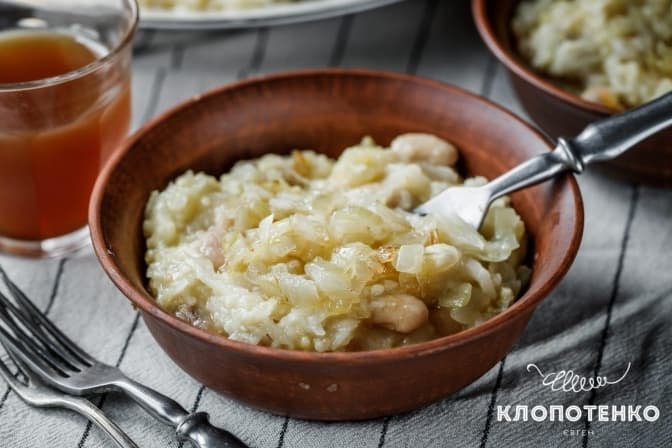 Інгредієнти: 500 г квашеної капусти, 200 мл води, ½ цибулини, 3 картоплини, 100 г білої квасолі, 100 г пшона, 50 мл олії, сіль та перець до смаку