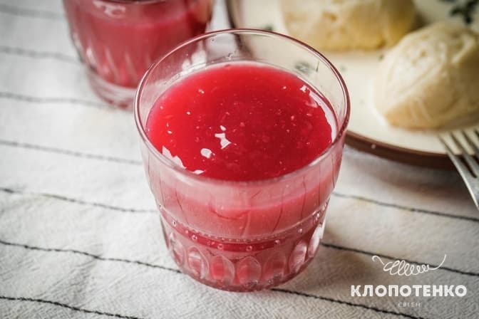 Інгредієнти: 2 л води, 1 буряк середнього розміру, 1 велика цибулина, 1 велика морква, 2 картоплини середнього розміру, 150 г білокачанної капусти, 2 ст. л. томатної пасти, 2 в'ялених груші, 1 ст. л. цукру, 2 лаврових листи, 2 зубчики часнику, 2 ст. л., соняшникової олії (для смаження), сіль і перець до смаку.