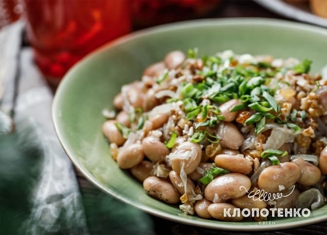 Інгредієнти: 300 г білої консервованої квасолі (або попередньо відвареної), 2 цибулини, 50 г родзинок (світлих без кісток), 50 г волоських горіхів, 3 пір’їни зеленої цибулі, 3 ст. л. соняшникової олії, сіль та перець до смаку.