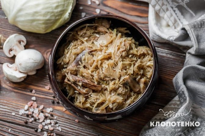 Інгредієнти: ½ середньої білокачанної капусти, 250 г квашеної капусти, 1 цибуля, 100 г білих свіжих чи заморожених грибів, 50 г сухих білих грибів, 300 г печериць, 1 ч. л. кмина, 250 мл води (для сухих грибів), 4 ст. л. соняшникової олії, сіль та перець до смаку.