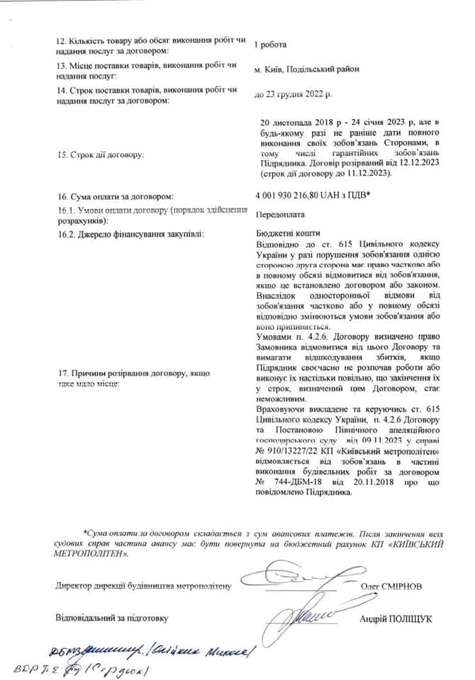 «Умовами договору визначили право замовника відмовитися від цього договору та вимагати відшкодування збитків, якщо підрядник своєчасно не розпочав роботи або виконує їх настільки повільно, що з виконати їх в строк договору неможливо. ... Враховуючи це, «Київський метрополітен» відмовляється від зобов’язань у частині виконання будівельних робіт за договором, про що повідомлено підрядника», — йдеться в обґрунтуванні.