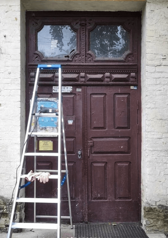 Активісти заклали дірку від старого домофону та замків. Також зробили латунну фурнітуру. Крім цього, замінили тріснуте скло. Тріщини проклеїли та підфарбували.