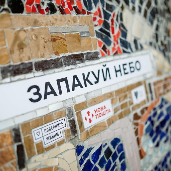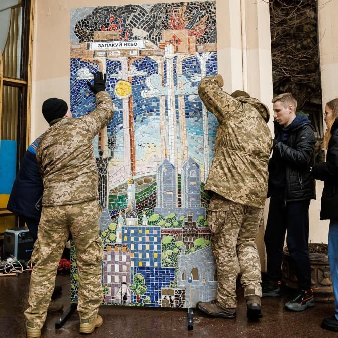 У Києві на Поштовій площі біля входу до фунікулера встановили мозаїчне панно «Запакуй небо» на честь Протиповітряної оборони України. Про це повідомляє студія мозаїки «Цілісно».