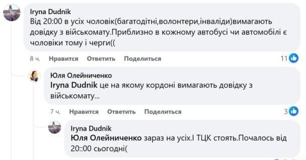 Також люди активно діляться своїм досвідом перетину кордону у соцмережах і зазначають, що тепер не пропускають чоловіків, які входять у категорії, що мають право на виїзд, але не мають довідки з центру комплектування. Зокрема, йдеться про волонтерів та інвалідів.