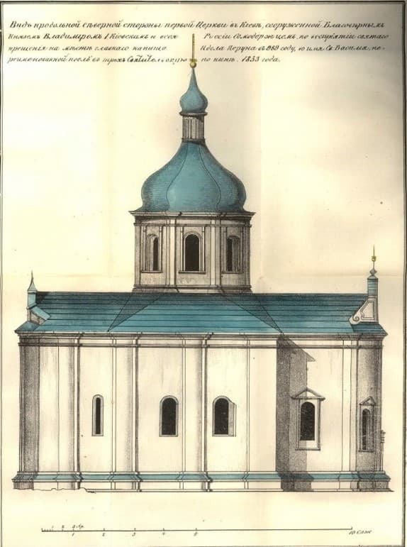 Сучасна історична наука вважає, що муровану церкву С.Василія Великого у 1183 р. побудував київський князь Святослав Всеволодович. Проте до XІХ ст. включно дослідники історії Києва фундатором означеного храму вважали князя Володимира Великого. Останній після повернення з Корсуня (де був охрещений та прийняв ім’я Василія) знищеного пантеону язичницьких богів – Перуновому пагорбі у 988 р. спорудив дерев’яну церкву Св.Василія, яка могла бути попередницею однойменного мурованого храму. Якщо це так, то церква Св.Василія Х ст. була другим християнським київським храмом після Десятинної церкви.